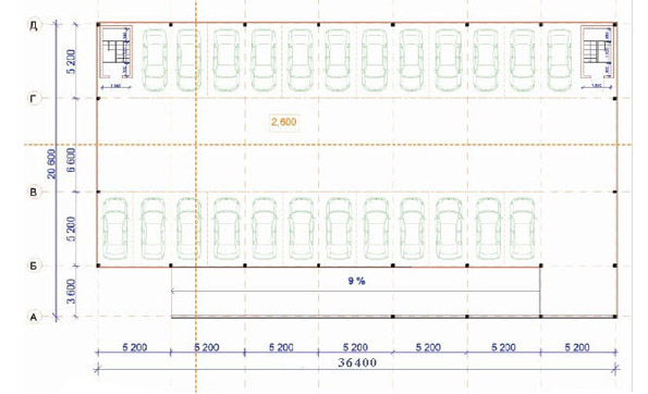Для въезда автомобилей на 2-й этаж предусмотрен пандус шириной 3,6 м