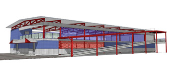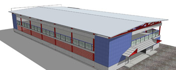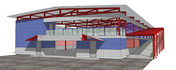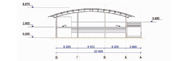 Архитектурное решение здания основано на сочетании светопрозрачной кровли из лексана по ажурных сводчатым фермам и ограждающих конструкций из перфорированного крашенного листа.
